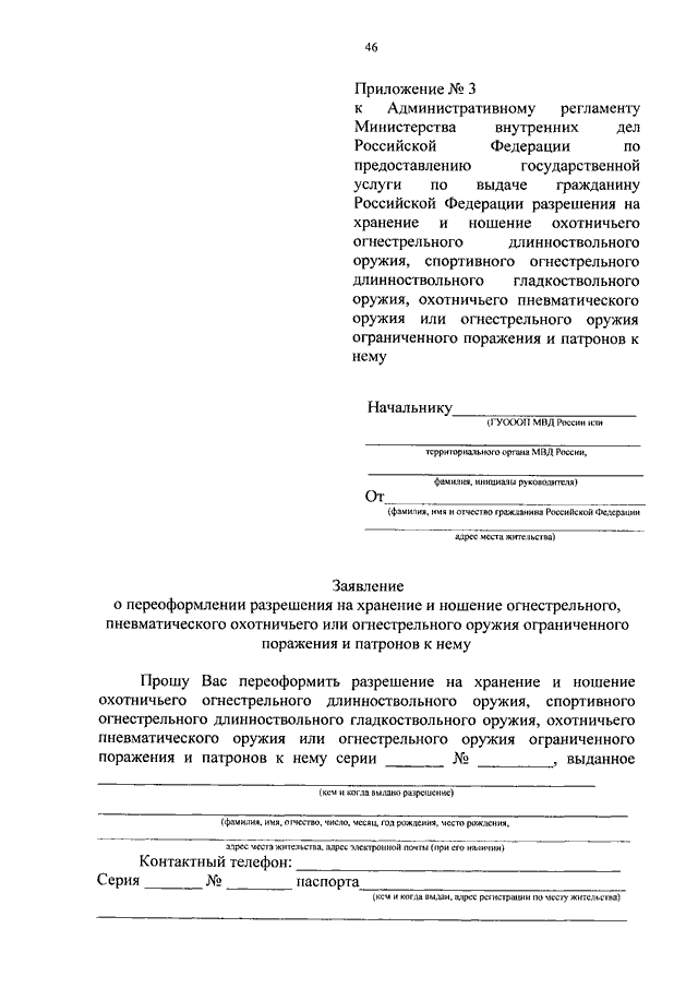 "ОБ УТВЕРЖДЕНИИ АДМИНИСТРАТИВНОГО РЕГЛАМЕНТА МИНИСТЕРСТВА ВНУТРЕННИХ ДЕЛ РОССИЙСКОЙ ФЕДЕРАЦИИ ПО ПРЕДОСТАВЛЕНИЮ ГОСУДАРСТВЕННОЙ УСЛУГИ ПО ВЫДАЧЕ ГРАЖДАНИНУ РОССИЙСКОЙ ФЕДЕРАЦИИ РАЗРЕШЕНИЯ НА ХРАНЕНИЕ И НОШЕНИЕ ОХОТНИЧЬЕГО ОГНЕСТРЕЛЬНОГО ДЛИННОСТВОЛЬНОГО ОРУЖИЯ, СПОРТИВНОГО ОГНЕСТРЕЛЬНОГО ДЛИННОСТВОЛЬНОГО ГЛАДКОСТВОЛЬНОГО ОРУЖИЯ, ОХОТНИЧЬЕГО ПНЕВМАТИЧЕСКОГО ОРУЖИЯ ИЛИ ОГНЕСТРЕЛЬНОГО ОРУЖИЯ ОГРАНИЧЕННОГО ПОРАЖЕНИЯ И ПАТРОНОВ К НЕМУ"