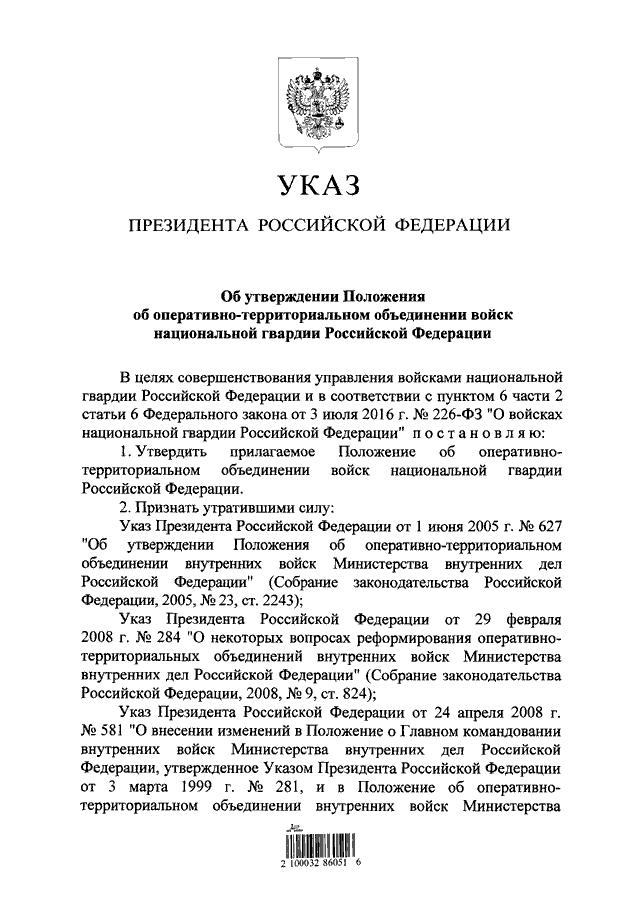"ОБ УТВЕРЖДЕНИИ ПОЛОЖЕНИЯ ОБ ОПЕРАТИВНО - ТЕРРИТОРИАЛЬНОМ ОБЪЕДИНЕНИИ ВОЙСК НАЦИОНАЛЬНОЙ ГВАРДИИ РОССИЙСКОЙ ФЕДЕРАЦИИ"