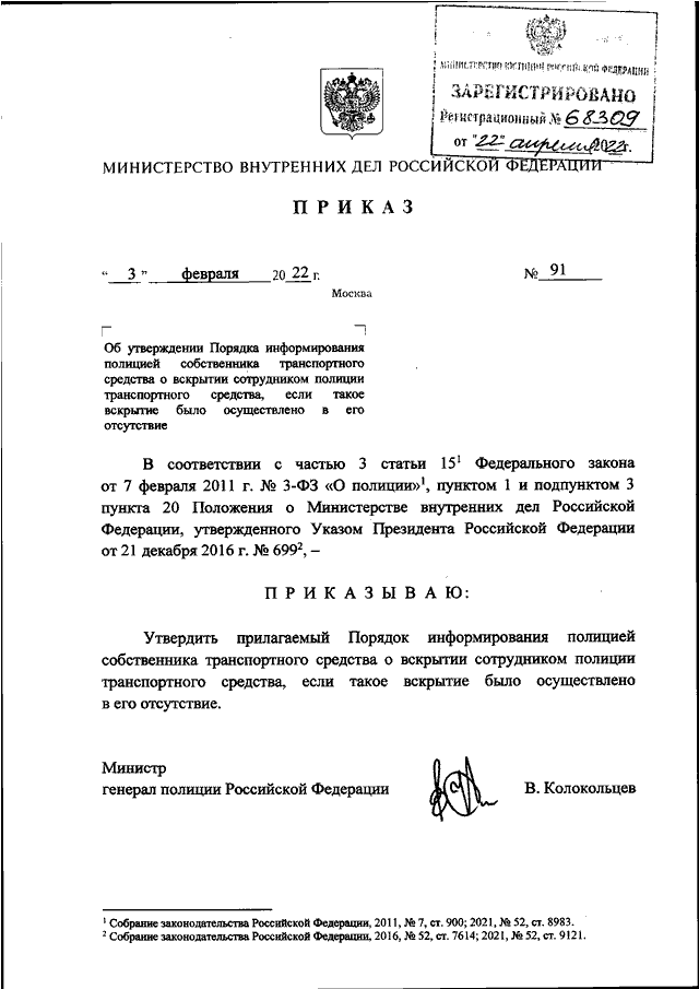 ПРИКАЗ МВД РФ от 03.02.2022 N 91