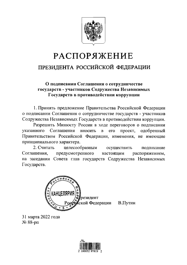 РАСПОРЯЖЕНИЕ Президента РФ от 31.03.2022 N 88-рп