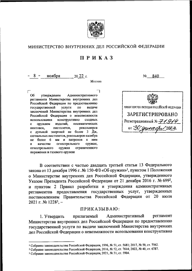 ПРИКАЗ МВД РФ от 08.11.2022 N 840