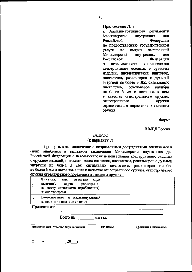 "ОБ УТВЕРЖДЕНИИ АДМИНИСТРАТИВНОГО РЕГЛАМЕНТА МИНИСТЕРСТВА ВНУТРЕННИХ ДЕЛ РОССИЙСКОЙ ФЕДЕРАЦИИ ПО ПРЕДОСТАВЛЕНИЮ ГОСУДАРСТВЕННОЙ УСЛУГИ ПО ВЫДАЧЕ ЗАКЛЮЧЕНИЙ МИНИСТЕРСТВА ВНУТРЕННИХ ДЕЛ РОССИЙСКОЙ ФЕДЕРАЦИИ О НЕВОЗМОЖНОСТИ ИСПОЛЬЗОВАНИЯ КОНСТРУКТИВНО СХОДНЫХ С ОРУЖИЕМ ИЗДЕЛИЙ, ПНЕВМАТИЧЕСКИХ ВИНТОВОК, ПИСТОЛЕТОВ, РЕВОЛЬВЕРОВ С ДУЛЬНОЙ ЭНЕРГИЕЙ НЕ БОЛЕЕ 3 ДЖ, СИГНАЛЬНЫХ ПИСТОЛЕТОВ, РЕВОЛЬВЕРОВ КАЛИБРА НЕ БОЛЕЕ 6 ММ И ПАТРОНОВ К НИМ В КАЧЕСТВЕ ОГНЕСТРЕЛЬНОГО ОРУЖИЯ, ОГНЕСТРЕЛЬНОГО ОРУЖИЯ ОГРАНИЧЕННОГО ПОРАЖЕНИЯ И ГАЗОВОГО ОРУЖИЯ"