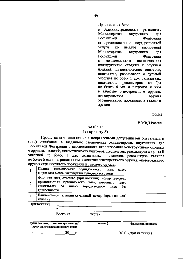 "ОБ УТВЕРЖДЕНИИ АДМИНИСТРАТИВНОГО РЕГЛАМЕНТА МИНИСТЕРСТВА ВНУТРЕННИХ ДЕЛ РОССИЙСКОЙ ФЕДЕРАЦИИ ПО ПРЕДОСТАВЛЕНИЮ ГОСУДАРСТВЕННОЙ УСЛУГИ ПО ВЫДАЧЕ ЗАКЛЮЧЕНИЙ МИНИСТЕРСТВА ВНУТРЕННИХ ДЕЛ РОССИЙСКОЙ ФЕДЕРАЦИИ О НЕВОЗМОЖНОСТИ ИСПОЛЬЗОВАНИЯ КОНСТРУКТИВНО СХОДНЫХ С ОРУЖИЕМ ИЗДЕЛИЙ, ПНЕВМАТИЧЕСКИХ ВИНТОВОК, ПИСТОЛЕТОВ, РЕВОЛЬВЕРОВ С ДУЛЬНОЙ ЭНЕРГИЕЙ НЕ БОЛЕЕ 3 ДЖ, СИГНАЛЬНЫХ ПИСТОЛЕТОВ, РЕВОЛЬВЕРОВ КАЛИБРА НЕ БОЛЕЕ 6 ММ И ПАТРОНОВ К НИМ В КАЧЕСТВЕ ОГНЕСТРЕЛЬНОГО ОРУЖИЯ, ОГНЕСТРЕЛЬНОГО ОРУЖИЯ ОГРАНИЧЕННОГО ПОРАЖЕНИЯ И ГАЗОВОГО ОРУЖИЯ"