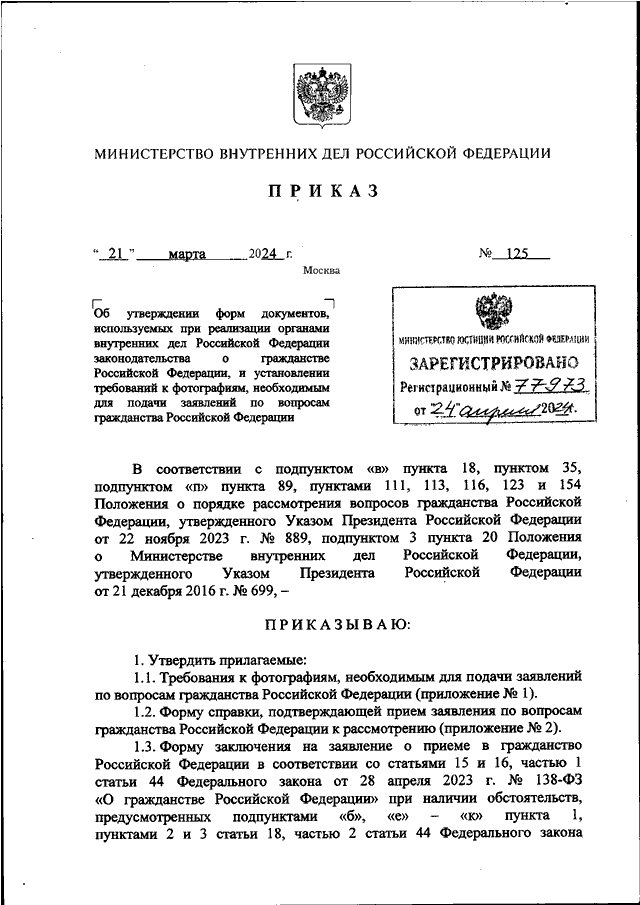 ПРИКАЗ МВД РФ от 21.03.2024 N 125