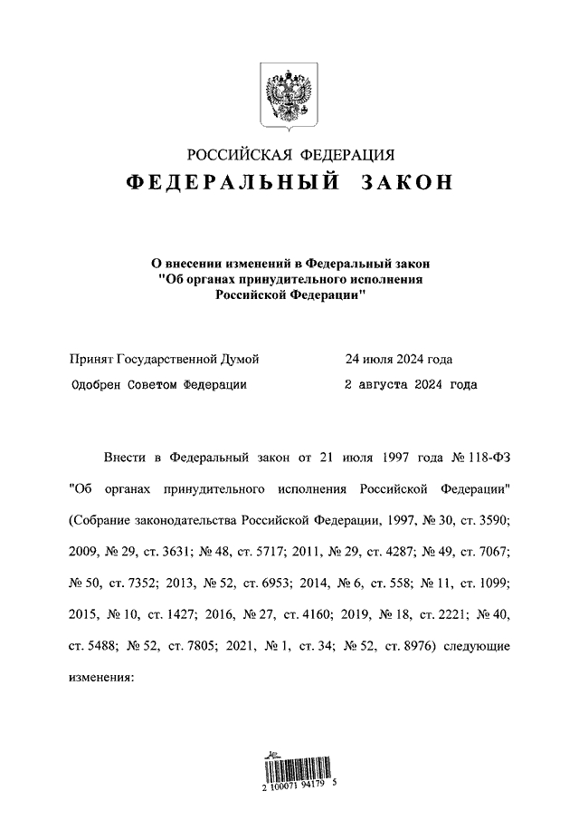 "О ВНЕСЕНИИ ИЗМЕНЕНИЙ В ФЕДЕРАЛЬНЫЙ ЗАКОН "ОБ ОРГАНАХ ПРИНУДИТЕЛЬНОГО ИСПОЛНЕНИЯ РОССИЙСКОЙ ФЕДЕРАЦИИ"