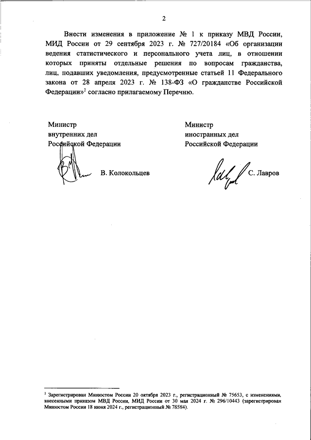 "О ВНЕСЕНИИ ИЗМЕНЕНИЙ В ПРИЛОЖЕНИЕ N 1 К ПРИКАЗУ МВД РОССИИ, МИД РОССИИ ОТ 29 СЕНТЯБРЯ 2023 Г. N 727/20184 "ОБ ОРГАНИЗАЦИИ ВЕДЕНИЯ СТАТИСТИЧЕСКОГО И ПЕРСОНАЛЬНОГО УЧЕТА ЛИЦ, В ОТНОШЕНИИ КОТОРЫХ ПРИНЯТЫ ОТДЕЛЬНЫЕ РЕШЕНИЯ ПО ВОПРОСАМ ГРАЖДАНСТВА, ЛИЦ, ПОДАВШИХ УВЕДОМЛЕНИЯ, ПРЕДУСМОТРЕННЫЕ СТАТЬЕЙ 11 ФЕДЕРАЛЬНОГО ЗАКОНА ОТ 28 АПРЕЛЯ 2023 Г. N 138-ФЗ "О ГРАЖДАНСТВЕ РОССИЙСКОЙ ФЕДЕРАЦИИ"