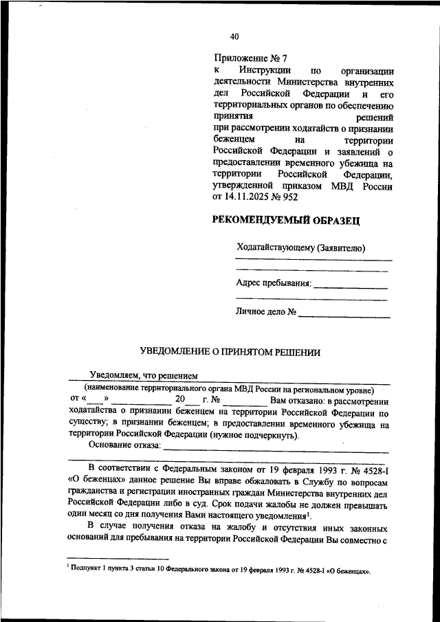 "ОБ УТВЕРЖДЕНИИ ИНСТРУКЦИИ ПО ОРГАНИЗАЦИЙ ДЕЯТЕЛЬНОСТИ МИНИСТЕРСТВА ВНУТРЕННИХ ДЕЛ РОССИЙСКОЙ ФЕДЕРАЦИИ И ЕГО ТЕРРИТОРИАЛЬНЫХ ОРГАНОВ ПО ОБЕСПЕЧЕНИЮ ПРИНЯТИЯ РЕШЕНИЙ ПРИ РАССМОТРЕНИИ ХОДАТАЙСТВ ПРИЗНАНИИ БЕЖЕНЦЕМ НА ТЕРРИТОРИИ РОССИЙСКОЙ ФЕДЕРАЦИИ И ЗАЯВЛЕНИЙ ПРЕДОСТАВЛЕНИИ ВРЕМЕННОГО УБЕЖИЩА И ТЕРРИТОРИИ РОССИЙСКОЙ ФЕДЕРАЦИИ ФОРМЫ ТАКОГО ЗАЯВЛЕНИЯ"