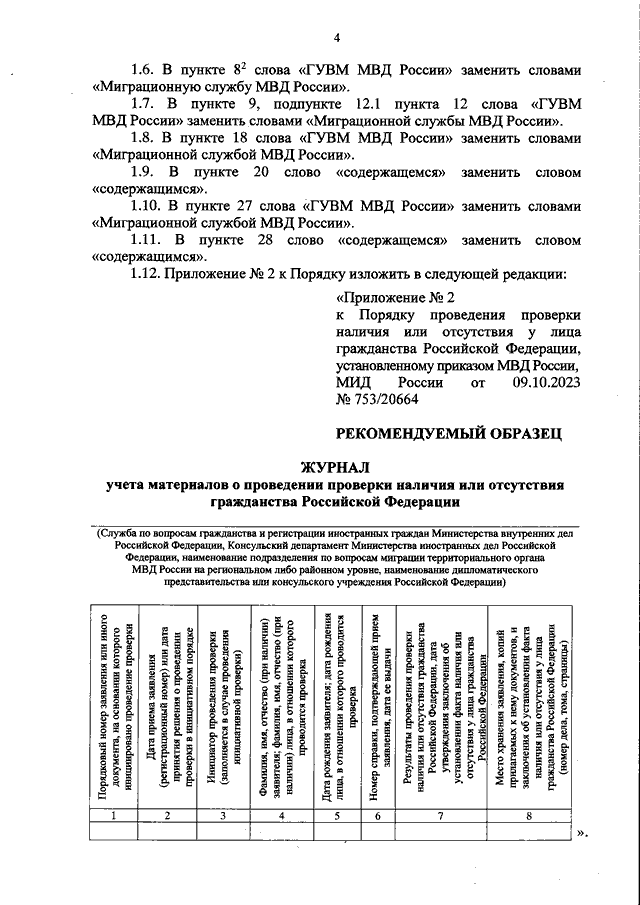 "О ВНЕСЕНИИ ИЗМЕНЕНИЙ В ПРИЛОЖЕНИЯ N 1 - N 5 К ПРИКАЗУ МВД РОССИИ, МИД РОССИИ ОТ 9 ОКТЯБРЯ 2023 Г. N 753/20664 "ОБ ОРГАНИЗАЦИИ РАБОТЫ ПО ПРОВЕДЕНИЮ ПРОВЕРКИ НАЛИЧИЯ ИЛИ ОТСУТСТВИЯ У ЛИЦА ГРАЖДАНСТВА РОССИЙСКОЙ ФЕДЕРАЦИИ В ЦЕЛЯХ РЕАЛИЗАЦИИ ПОЛНОМОЧИЙ, ПРЕДУСМОТРЕННЫХ ЧАСТЯМИ 4 И 6 СТАТЬИ 40 ФЕДЕРАЛЬНОГО ЗАКОНА ОТ 28 АПРЕЛЯ 2023 Г. N 138-ФЗ "О ГРАЖДАНСТВЕ РОССИЙСКОЙ ФЕДЕРАЦИИ"