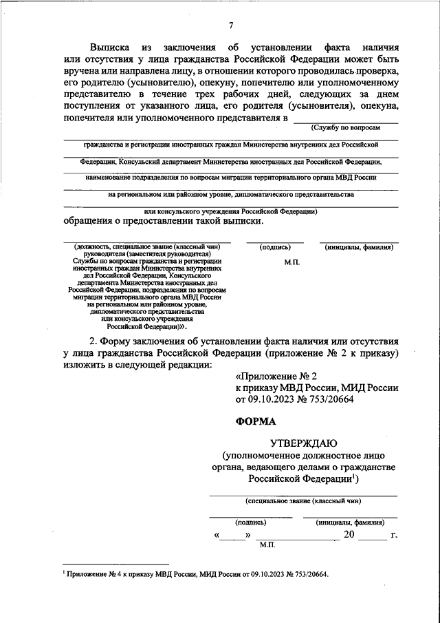 "О ВНЕСЕНИИ ИЗМЕНЕНИЙ В ПРИЛОЖЕНИЯ N 1 - N 5 К ПРИКАЗУ МВД РОССИИ, МИД РОССИИ ОТ 9 ОКТЯБРЯ 2023 Г. N 753/20664 "ОБ ОРГАНИЗАЦИИ РАБОТЫ ПО ПРОВЕДЕНИЮ ПРОВЕРКИ НАЛИЧИЯ ИЛИ ОТСУТСТВИЯ У ЛИЦА ГРАЖДАНСТВА РОССИЙСКОЙ ФЕДЕРАЦИИ В ЦЕЛЯХ РЕАЛИЗАЦИИ ПОЛНОМОЧИЙ, ПРЕДУСМОТРЕННЫХ ЧАСТЯМИ 4 И 6 СТАТЬИ 40 ФЕДЕРАЛЬНОГО ЗАКОНА ОТ 28 АПРЕЛЯ 2023 Г. N 138-ФЗ "О ГРАЖДАНСТВЕ РОССИЙСКОЙ ФЕДЕРАЦИИ"