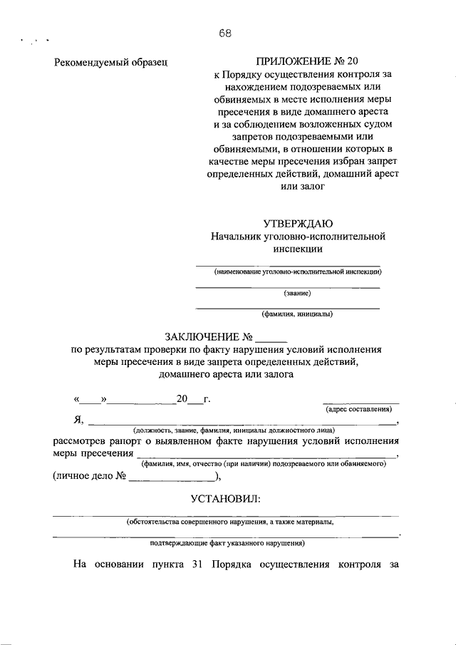 "ОБ УТВЕРЖДЕНИИ ПОРЯДКА ОСУЩЕСТВЛЕНИЯ КОНТРОЛЯ ЗА НАХОЖДЕНИЕМ ПОДОЗРЕВАЕМЫХ ИЛИ ОБВИНЯЕМЫХ В МЕСТЕ ИСПОЛНЕНИЯ МЕРЫ ПРЕСЕЧЕНИЯ В ВИДЕ ДОМАШНЕГО АРЕСТА И ЗА СОБЛЮДЕНИЕМ ВОЗЛОЖЕННЫХ СУДОМ ЗАПРЕТОВ ПОДОЗРЕВАЕМЫМИ ИЛИ ОБВИНЯЕМЫМИ, В ОТНОШЕНИИ КОТОРЫХ В КАЧЕСТВЕ МЕРЫ ПРЕСЕЧЕНИЯ ИЗБРАН ЗАПРЕТ ОПРЕДЕЛЕННЫХ ДЕЙСТВИЙ, ДОМАШНИЙ АРЕСТ ИЛИ ЗАЛОГ"