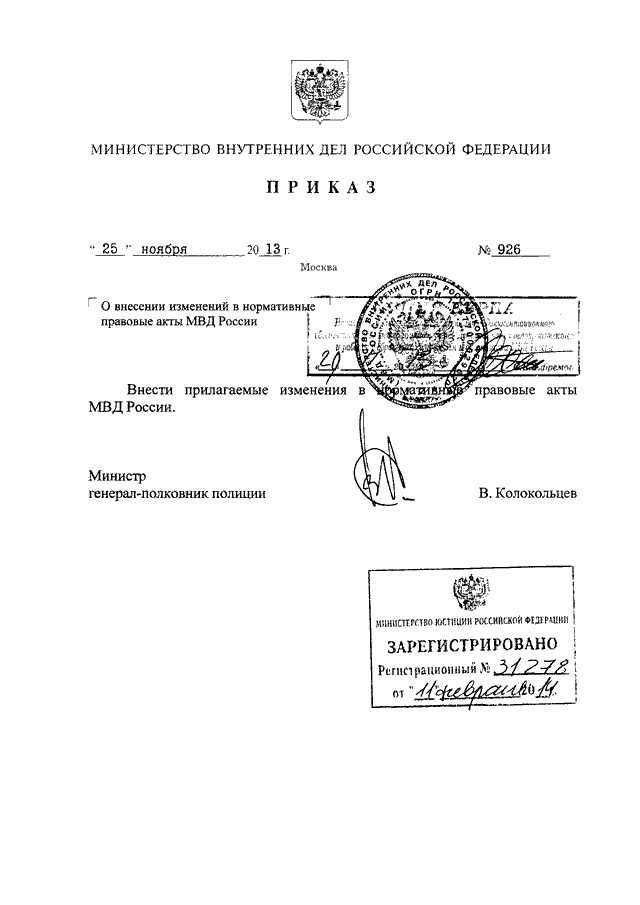 ПРИКАЗ МВД РФ от 25.11.2013 N 926